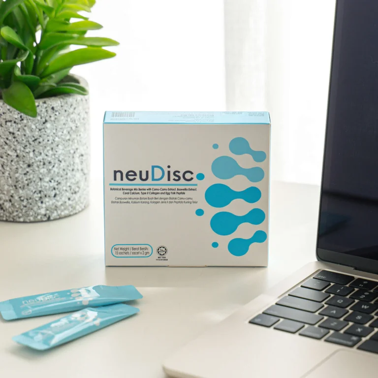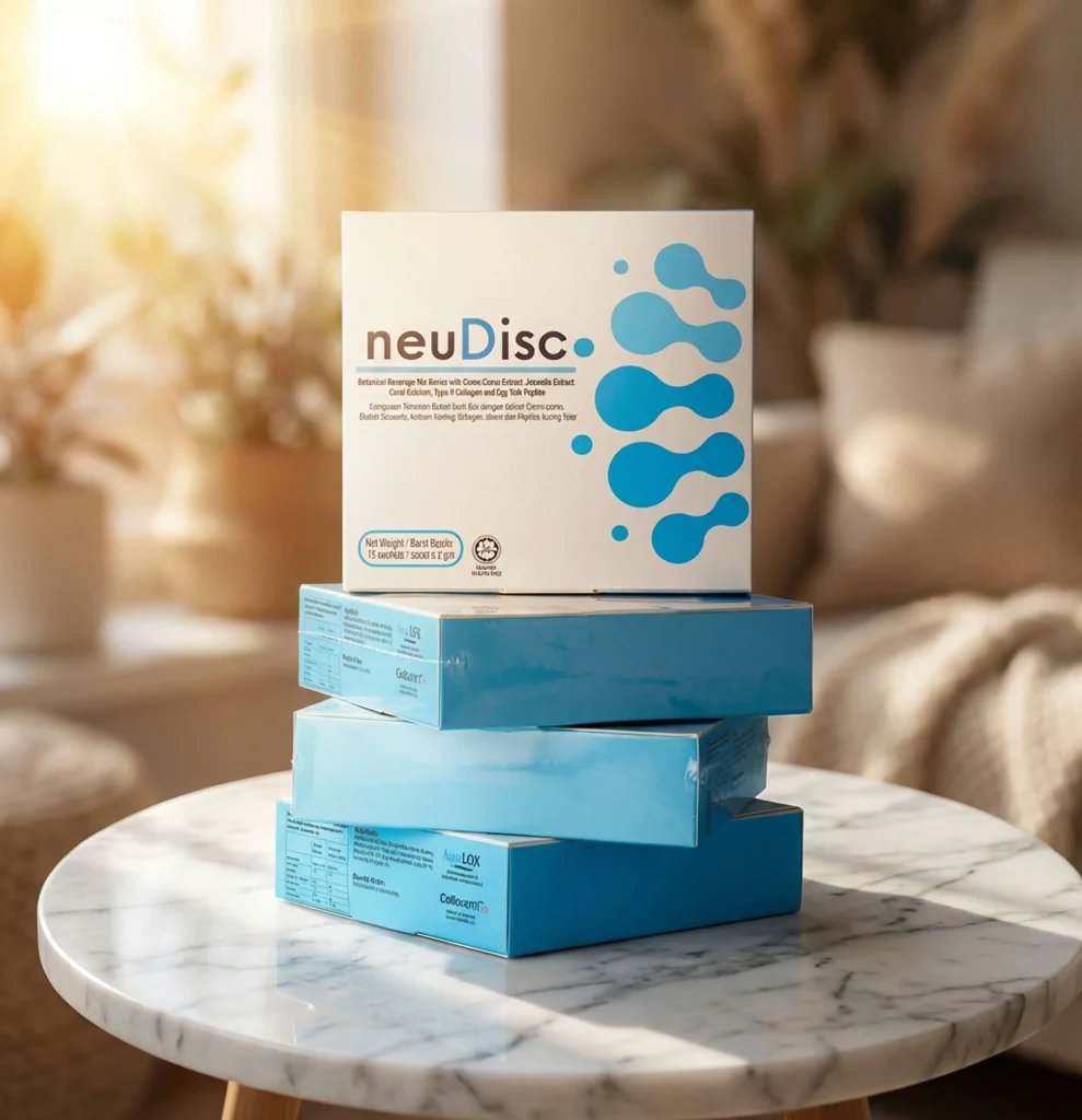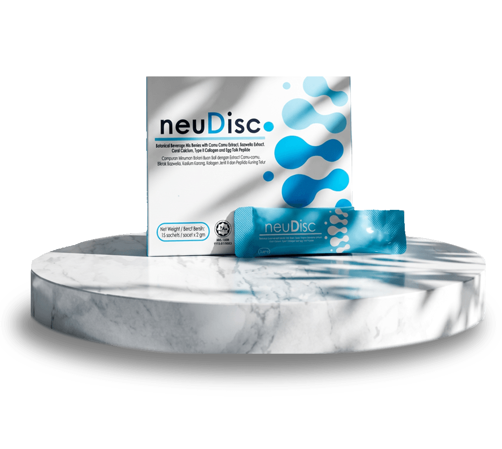 Neudisc is a daily supplement formulated to support healthy discs and joints. With native Type II Collagen (Collavant® ) , Boswellia Serrata (AquaLOX™) , Egg Yolk Peptide (Bonepep®), Coral Calcium, and Camu Camu ,it helps maintain cartilage integrity, reduce inflammation, and support bone strength.